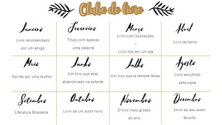- Juntamente com outras blogueiras estou participando de um clube de leitura. Mais um, rs. Funciona assim: temos um calendário e em cada mês lemos um livro que caiba na sugestão do mês. Na última sexta-feira do mês, faremos a resenha dos livros escolhidos em cada um dos blogs.